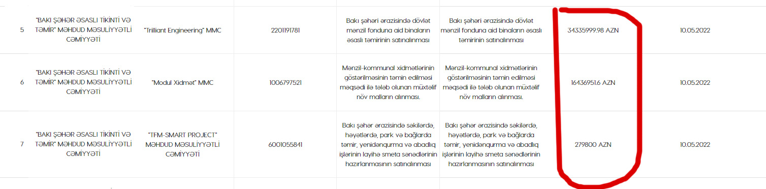 “Bakı Şəhər Əsaslı Tikinti və Təmir” "Trilliant Engineering" şirkətilə məbləği 34 milyon 336 min manat, "Modul Xidmət" şirkətilə 16 milyon 437 min manat, "TFM-Smart Project" şirkətilə 279 min 800 manat olan müqavilələr imzalayıb.