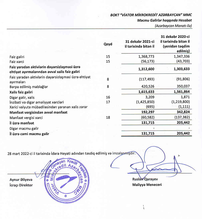 BOKT “Viator Mikrokredit Azərbaycan” MMC 2021-ci ili 132 min manat xalis mənfəət ilə başa vurub. Təşkilat 2020-ci ili 205 min manat xalis mənfəət ilə bağlamışdı. Beləliklə,“Viator Mikrokredit Azərbaycan”ın xalis mənfəəti 2020-ci illə müqayisədə 2021-ci ildə 35,6% azalıb.