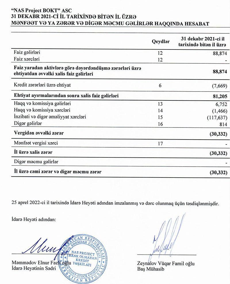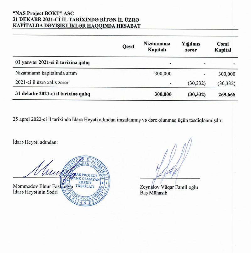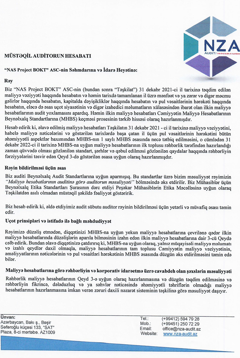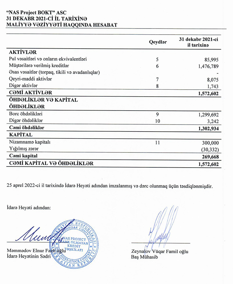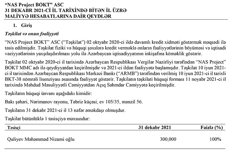Fəaliyyət göstərdiyi yarım il ərzində kredit təşkilatının böyüklüyü 1,5 milyon manatı keçib.2021-ci ildə fəaliyyətə başlamış “NAS Project BOKT” ASC 31 dekabr 2021-ci il tarixində bitən il üzrə audit olunmuş maliyyə hesabatlarını açıqlayıb.