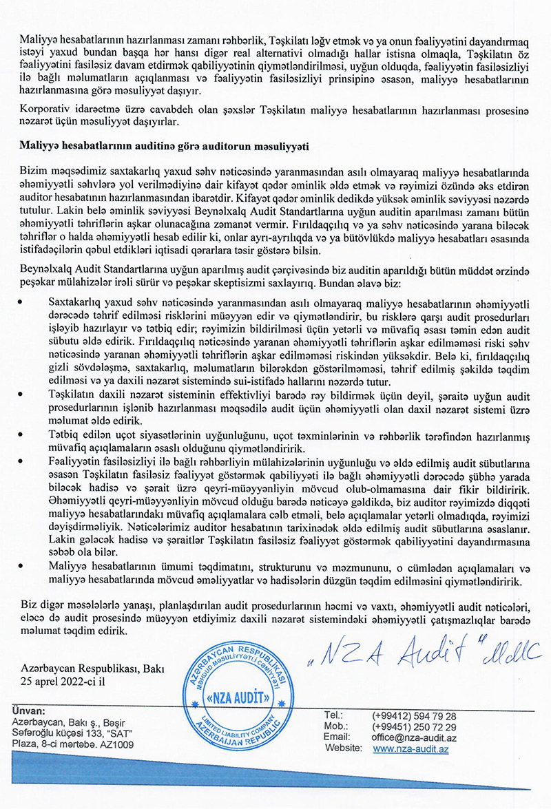 “NAS Project BOKT” ASC fəaliyyətinin ilk ili üzrə maliyyə göstəricilərini açıqladı