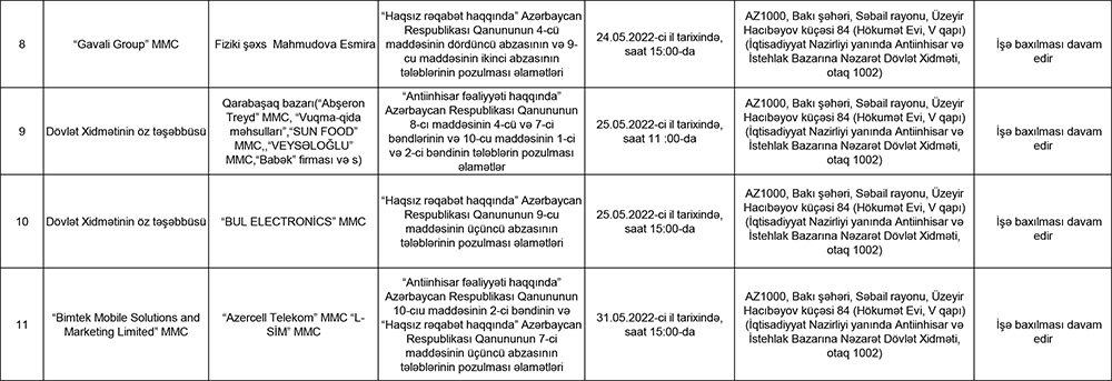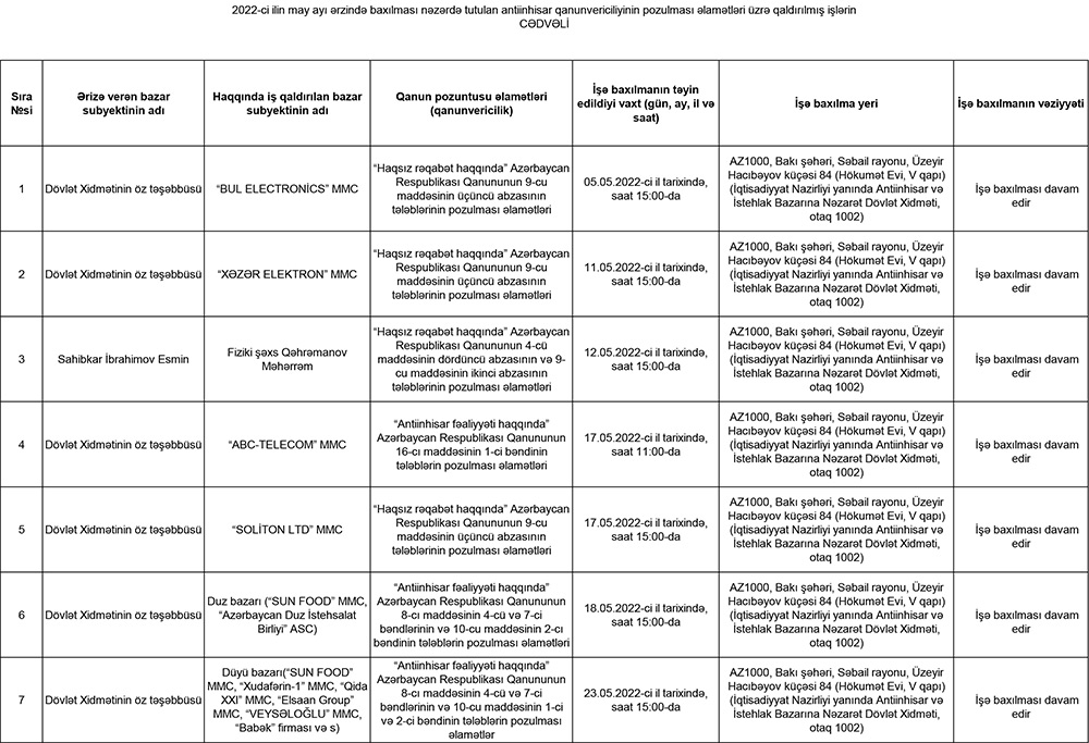 Marja.az Xidmətə istinadən xəbər verir ki, araşdırma zamanı “Azərbaycan Duz İstehsalat Birliyi” ASC və “SunFood” MMC tərəfindən antiinhisar qanunvericiyilinin pozulması əlamətləri aşkar olunaraq həmin təsərrüfat subyektləri barədə iş qaldırılıb.