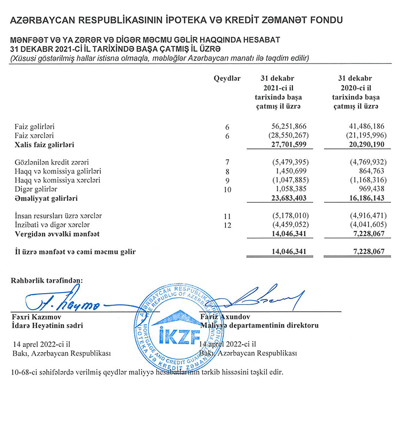 İpoteka və Kredit Zəmanət Fondu 2021-ci ili 14 milyon 46 min manat xalis mənfəət ilə başa vurub. Halbuki, Fond 2020-ci ili 7 milyon 228 min manat xalis mənfəət ilə bağlamışdı. Beləliklə, İpoteka və Kredit Zəmanət Fondunun xalis mənfəəti 2020-ci illə müqayisədə 2021-ci ildə təxminən 2 dəfə artıb.