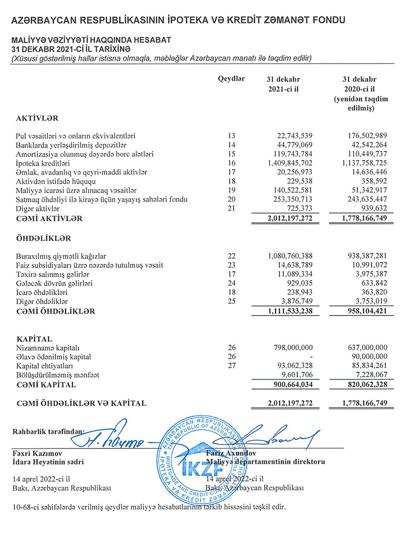 31 Dekabr 2021-ci il tarixində İpoteka və Kredit Zəmanət Fondunun ipoteka kreditləri portfeli 1 milyard 410 min manat təşkil edib. 2020-ci ilin sonunda Fondun ipoteka kreditləri portfeli 1 milyard 138 milyon manat idi.