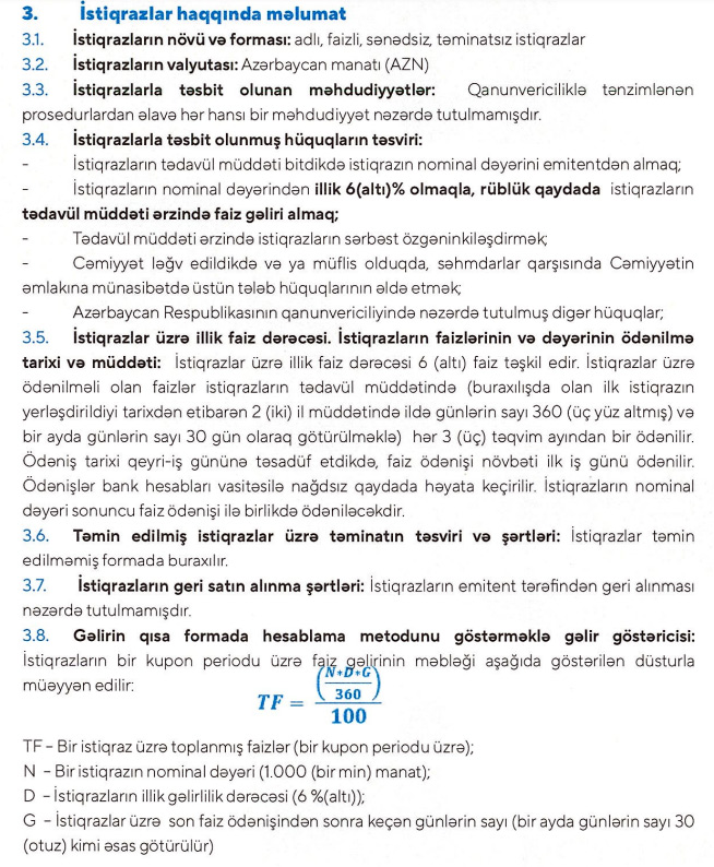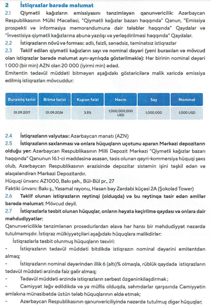 Qiymətli kağızlar 2 il tədavüldə olacaq. İllik gəlirliliyi isə 6%-dir. Faizlər rüblük ödəniləcək. Prosesin anderrayteri “ABB-İnvest” İnvestisiya Şirkəti QSC-dir.