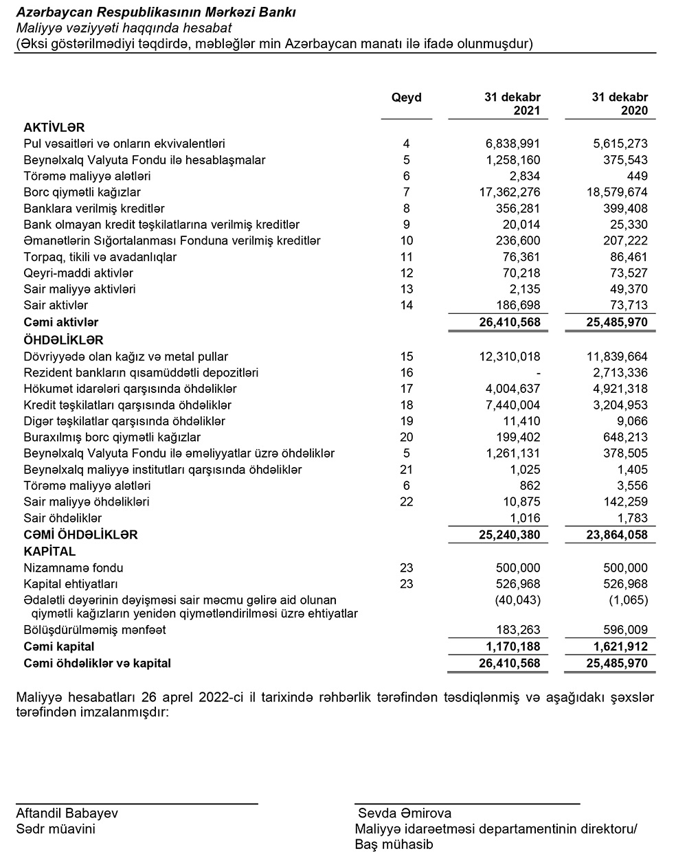 Mərkəzi Bankın 2020-ci ilin sonunda 596 milyon 9 min manat təşkil etmiş bölüşdürülməmiş mənfəəti 2021-ci ilin sonunda 183 milyon 263 min manaat təşkil edib. 412 milyon 746 min manatlıq azalmanın 250 milyon manatı dövlət büdcəsinə köçürmə, 162 milyon 746 min manatı isə ötən ilin xalis zərər ilə bağlıdır.