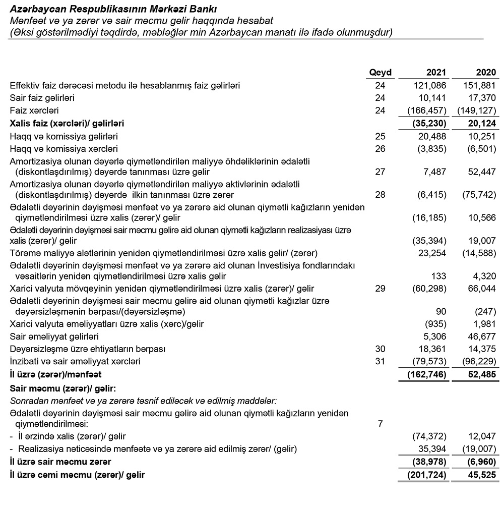 Azərbaycan Mərkəzi Bankı 2021-ci ili 162 milyon 746 min manat xalis zərər ilə başa vurub. Halbuki, qurum 2020-ci ili 52 milyon 485 min manat xalis mənfəət ilə bağlamışdı.