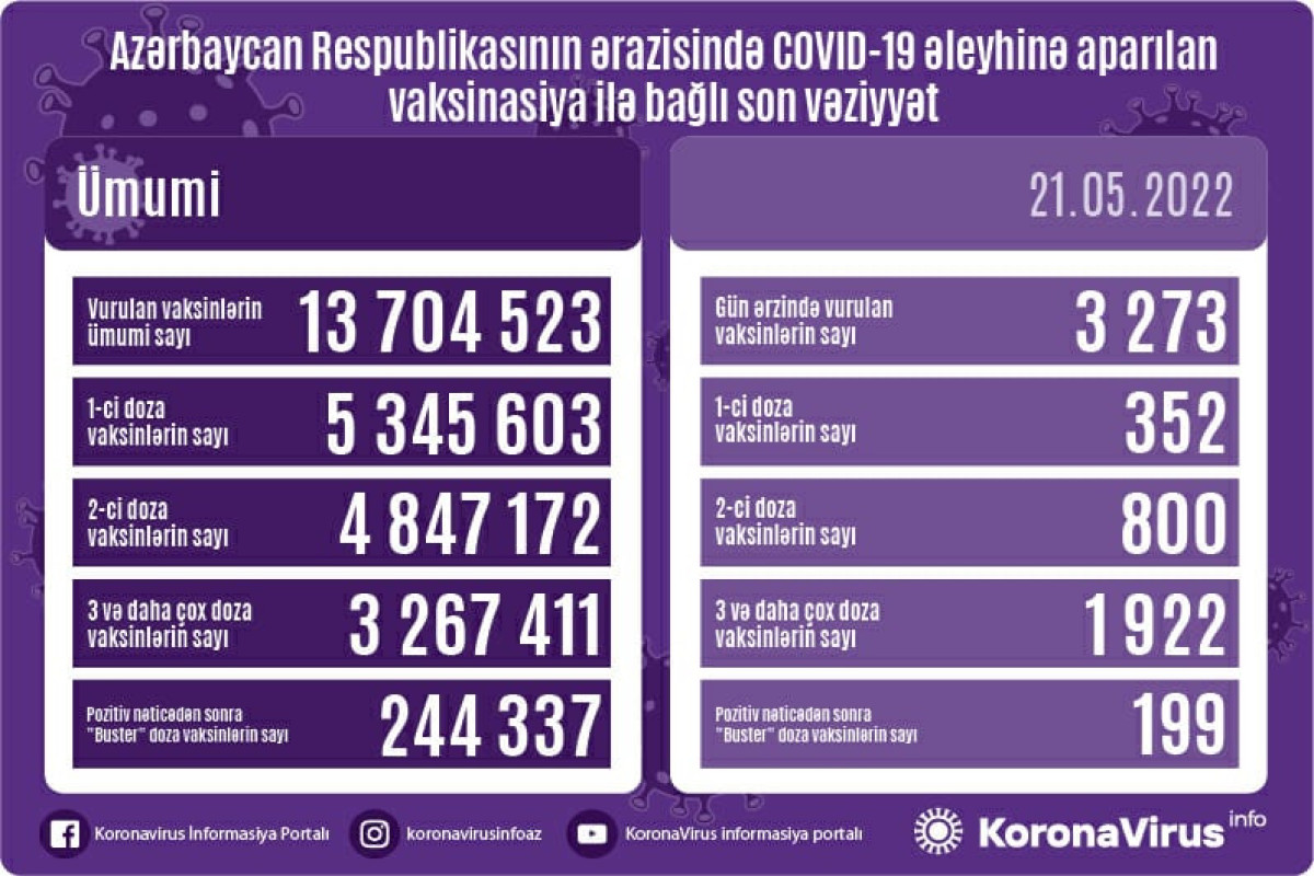 Azərbaycanda son sutkada koronavirus (COVID-19) əleyhinə 3273 vaksin vurulub. Bir gündə birinci mərhələ üzrə vaksinasiya olunanların sayı 352, ikinci mərhələ üzrə vaksinasiya olunanların sayı 800, üç və daha çox doza vaksin vurduranların sayı 1 922, pozitiv nəticədən sonra buster doza üzrə vaksinasiya olunanların sayı isə 199 nəfərdir.