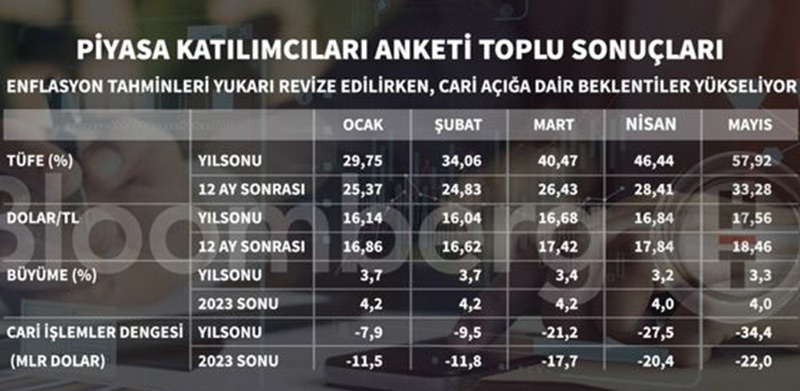 Sorğuya görə, Türkiyədə ilin sonuna inflyasiya 57,92%, iqtisadi artım ilkin nəzərdə tutulan 3,2% əvəzinə 3,3%, ABŞ dolları/Türki lirəsi məzənnəsi 17,57 lirə və bir il sonra 18,47 lirə təşkil edəcək. Bazar ertəsi dollar 15,9 lirəyə bərabər olub.