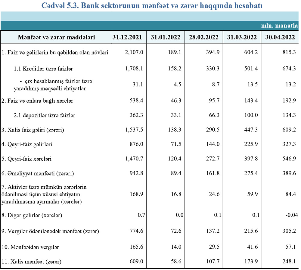 Bankların 2021-ci ilin 4 ayında faiz gəlirləri 662,6 milyon manat ikən, 2022-ci ilin ilk 4 ayında 815,3 milyon manat təşkil edib. Qeyri-faiz gəlirləri isə 236,3 milyon manatdan 327,3 milyon manata yüksəlib.