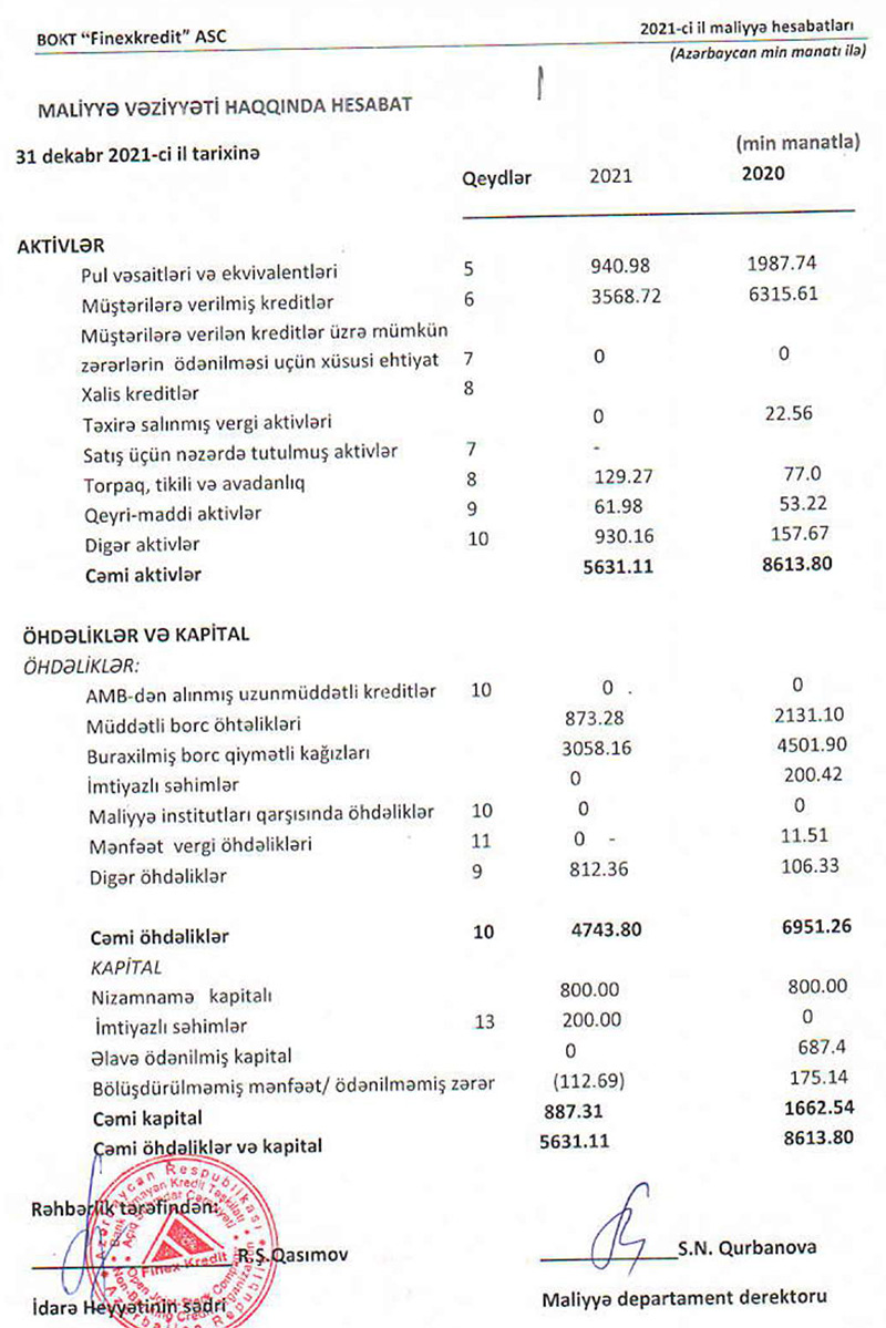 BOKT "Finex Kredit" ASC 2021-ci ili 312 min manat xalis zərər ilə başa vurub. Halbuki, təşkilat 2020-ci ili 197 min manat xalis mənfəət ilə bağlamışdı.