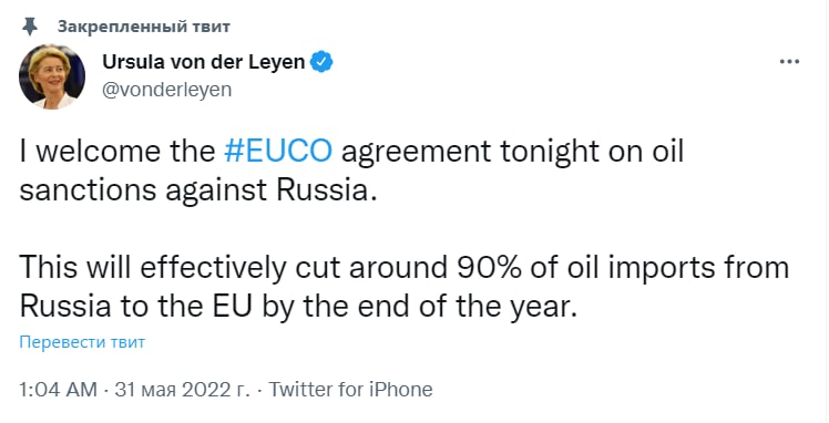 "Mən Avropa Şurasında Rusiyaya qarşı Neft Sanksiyaları üzrə razılaşmanı alqışlayıram. Bu, ilin sonuna kimi Avropa ittifaqı Rusiyadan neft idxalını 90% azaldacaq", - fon der Leyen öz Twitter səhifəsində yazıb.