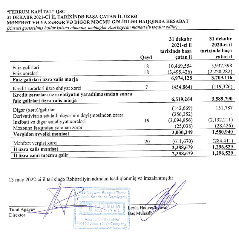 Marja.az xəbər verir ki, "Ferrum Kapital"ın faiz gəlirləri 2020-ci ildə 5 milyon 937 min manat ikən, 2021-ci ildə 10 milyon 470 min manata yüksəlib (76,4% artıb).