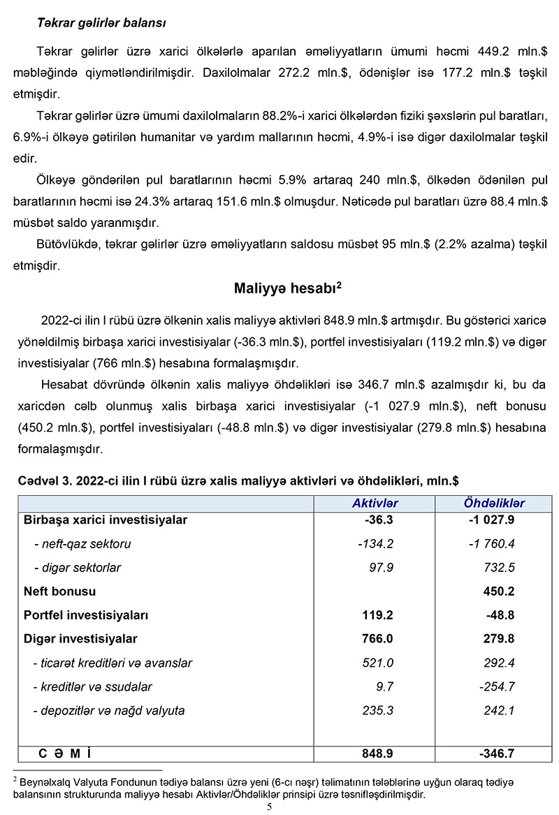 Mərkəzi Bank qeyd edib ki, 2022-ci ilin 1-ci rübündə tədiyə balansı əsasən qlobal əmtəə bazarlarında neft-qaz qiymətlərinin və qeyri-neft ixracının əhəmiyyətli artımından təsirlənmişdir. Cari əməliyyatlar balansında 4 milyard dollar profisit, kapital və maliyyənin hərəkəti hesabında isə 1.2 milyard dollar kəsir yaranmış, ehtiyat aktivləri təxminən 1.6 milyard dollar artmışdır.