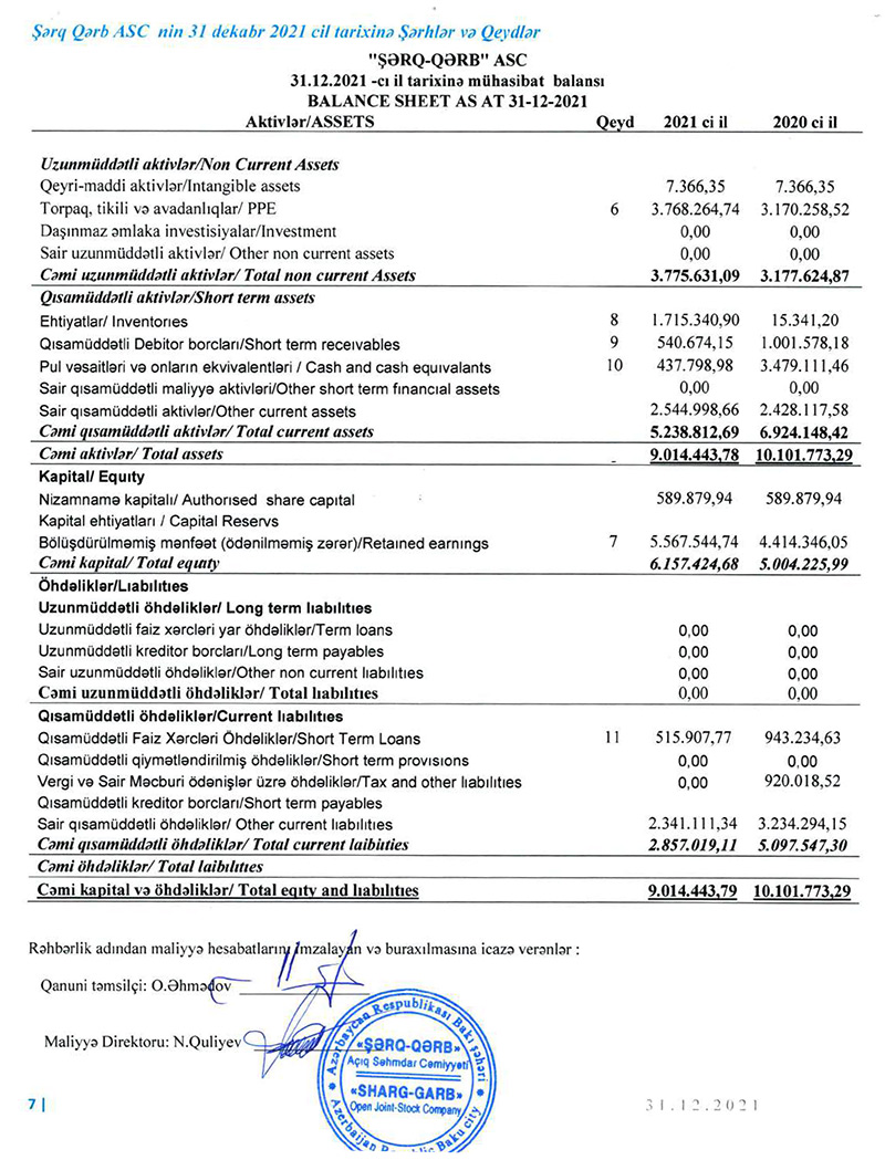 31 Dekabr 2021-ci il tarixində "Şərq-Qərb" ASC 9 milyon 14 min manat cəmi aktivlərə malik olub. Şirkət 2020-ci ilin sonunda 10 milyon 102 min manat cəmi aktivlərə malik idi.