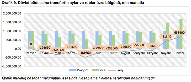 “Neft Fondundan Dövlət büdcəsinə transfert aylar üzrə yanvar ayı istisna olmaqla digər aylarda əhəmiyyətli kənarlaşmalar müşahidə edilmiş, ümumilikdə proqnozlaşdırılan transfert məbləği 850 milyon manat kəsirlə icra edilmişdir. 2021-ci ildə ARDNF-dən dövlət büdcəsinə 11 milyard 350 milyon manat vəsait transfer edilmiş və bu xərc maddəsi büdcədə nəzərdə tutulana (12 milyard 200 milyon manat) nisbətən 93 faiz səviyyəsində icra edilmiş və yaxud 7 faiz az icra olmuşdur”,- Rəydə bildirilir.
