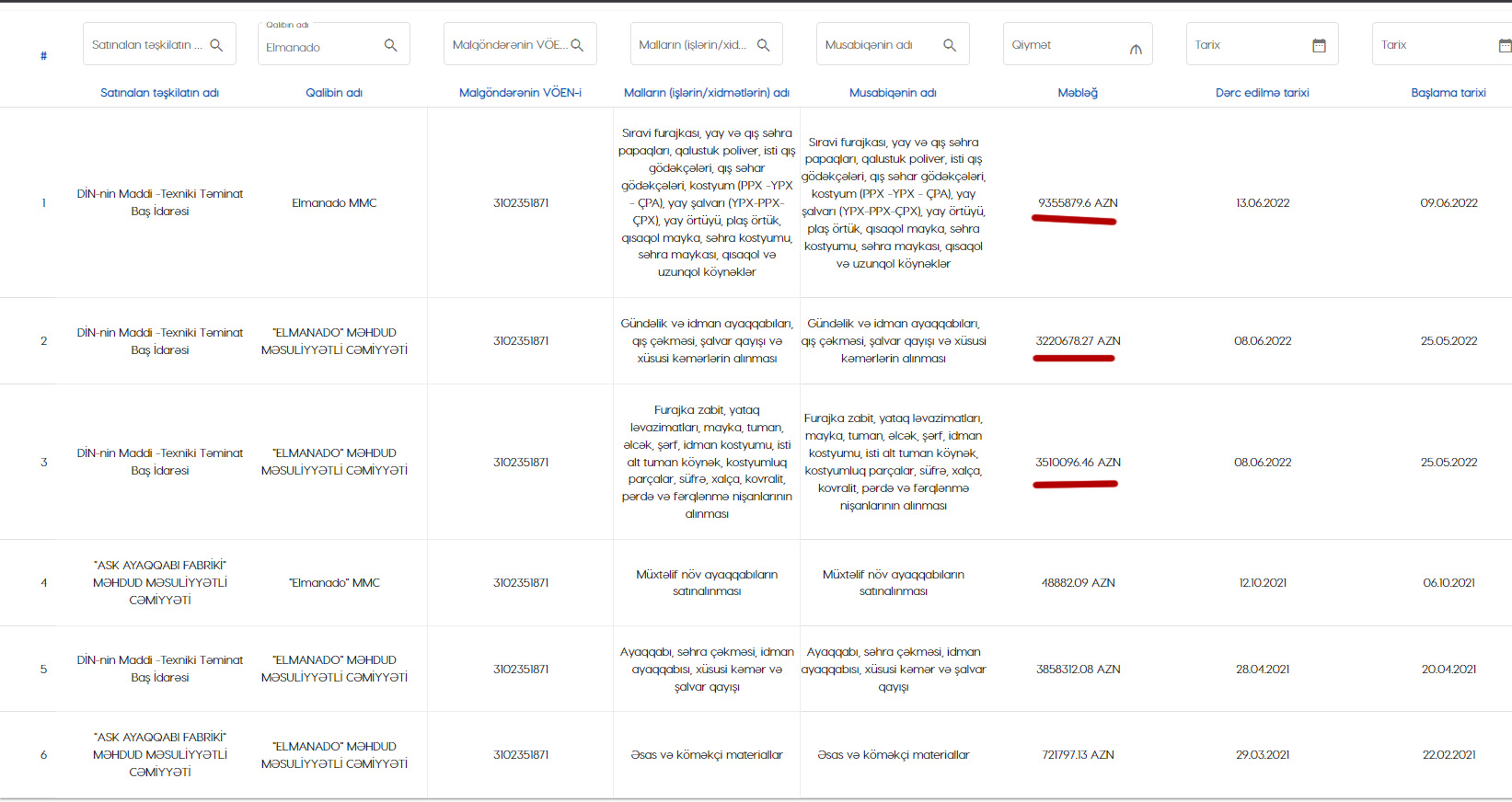 Daxili İşlər Nazirliyinin Maddi - Texniki Təminat Baş İdarəsi "Elmanado" MMC şirkətinə 3 tender üzrə 16 milyon 87 min manatlıq sifarişlər verib.