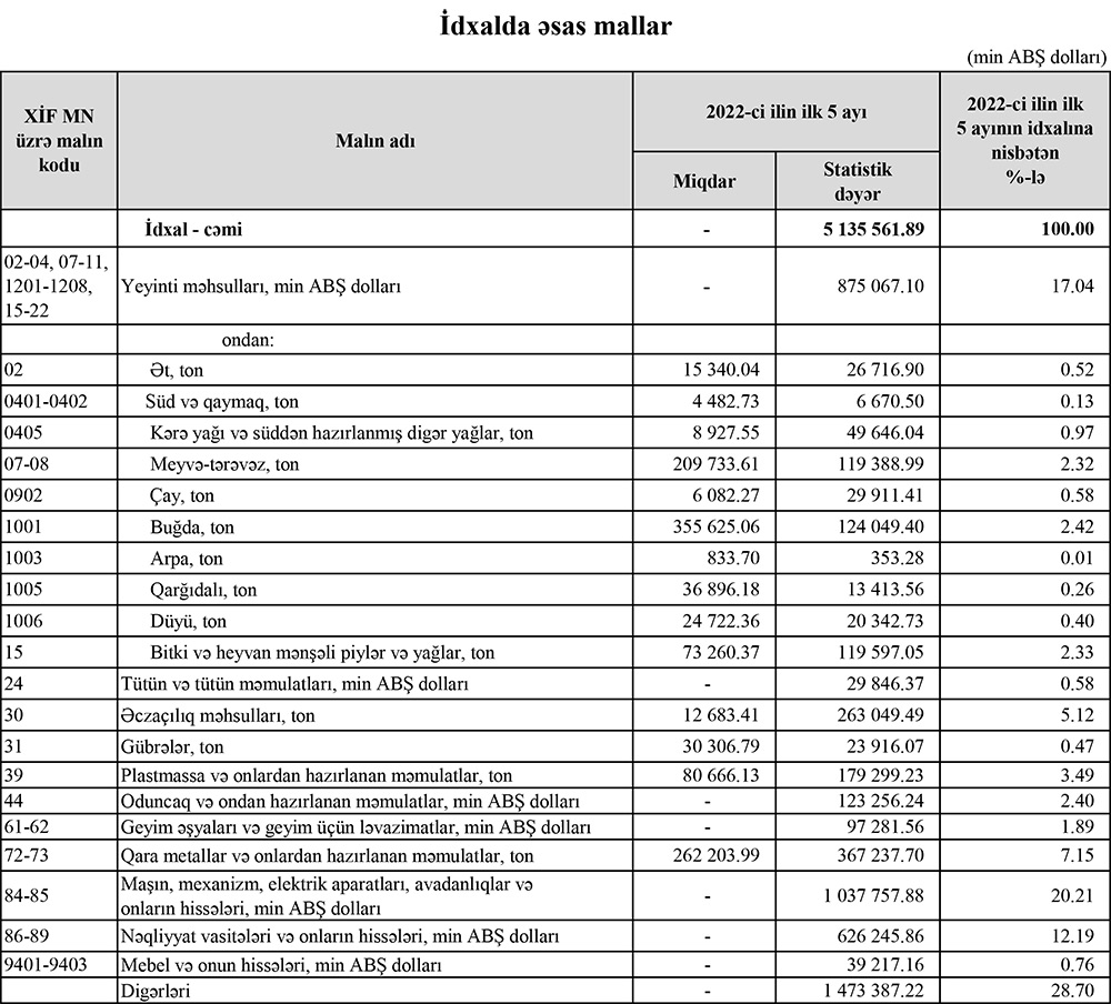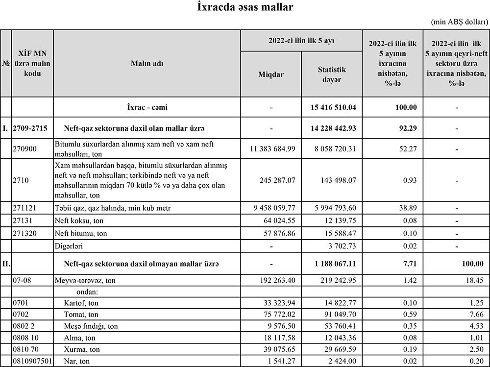 2022-ci ilin yanvar-may aylarında (5 ayda) Azərbaycanın ən çox ixrac və idxal etdiyi mallar açıqlanıb.
