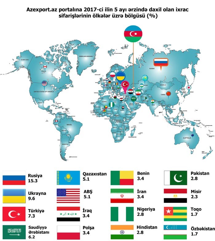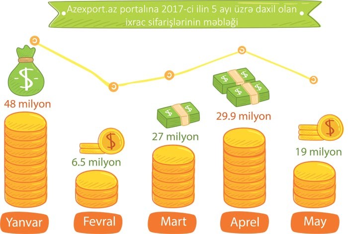 Ümumilikdə isə Azexport.az portalına 2017-ci ilin yanvar ayında 48 milyon ABŞ dolları, fevral ayında 6.5 milyon ABŞ dolları, mart ayında 27 milyon ABŞ dolları, aprel ayında 29.9 milyon ABŞ dolları, may ayında 19 milyon ABŞ dolları dəyərində ixrac sifarişləri daxil olub. Ümumilikdə götürdükdə 2017-ci ilin 5 ayı ərzində Azexport.az portalına 45 ölkədən 130 milyon ABŞ dolları məbləğində ixrac sifarişləri daxil olub.