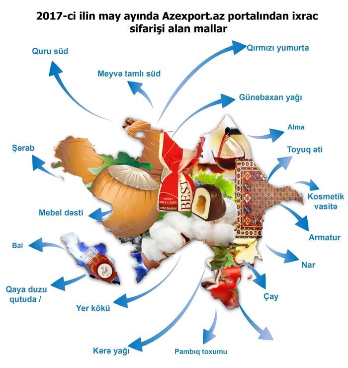 “Azexport.az” portalının qeyri-neft sektoru üzrə ixraca töhfə verməsinə gəlincə isə “İxrac İcmalı”nda qeyd edilir ki, 2017-ci ilin may ayında daxil olan sifarişlərin ümumi dəyəri isə 19 milyon ABŞ dolları olmuşdur. May ayında ilk dəfə portala Slovakiya, Tayvan və Surinam Respublikasından sifarişlər daxil olub. May ayında sifarişləri məhsullar üzrə təhlil etdikdə aydın olur ki, qeyri-neft sektorunda istehsal edilən müxtəlif məhsullar - quru süd, meyvə tamlı süd, qırmızı yumurta, günəbaxan yağı, toyuq əti, armatur, yer kökü, şərab, kərə yağı, pambıq toxumu, alma, kosmetik vasitə, makaron, kərpic, nar, qaya duzu, avtomobil diaqnostika aparatı , çay, yataq dəsti, ipək xalça, mebel dəsti, mühərrik yağı, qənnadı məhsulları, boya, nar şirəsi sifariş olunanlar arasındadır.
