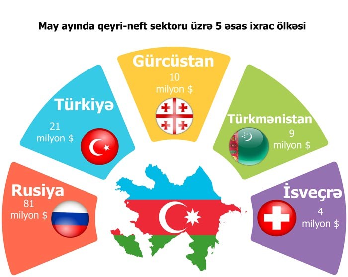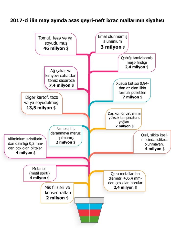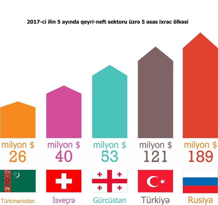 2017-ci ilin 5 ayı ərzində isə qeyri-neft sektoru üzrə ixrac 557 milyon ABŞ dolları olmuşdur. Bu ixrac əməliyyatlarında 1021 şirkət iştirak etmişdir. 2017-ci ilin 5 ayı ərzində qeyri-neft məhsullarının ixrac edildiyi ölkələrin siyahısında ilk beşlikdə Rusiya, Türkiyə, Gürcüstan, İsveçrə və Türkmənistan var.