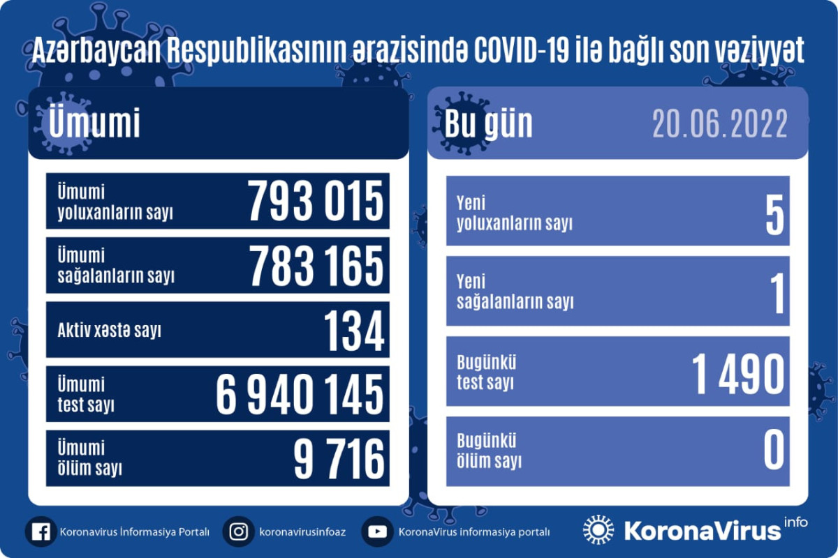 Azərbaycan Respublikasında koronavirus (COVID-19) infeksiyasına 5 yeni yoluxma faktı qeydə alınıb, 1 nəfər müalicə olunaraq sağalıb.