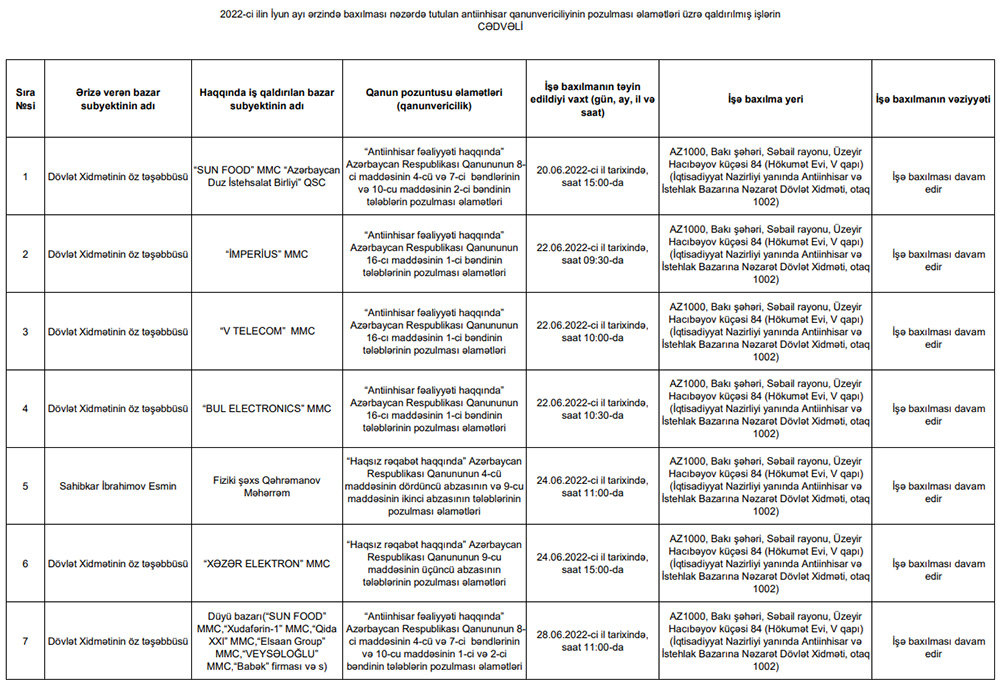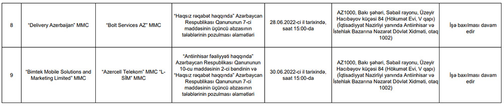 Sorğuda tələb olunan sənəd və məlumatları təqdim etməyən “V-TELECOM” MMC, “İMPERİUS” MMC və “BUL ELECTRONİCS” MMC barəsində antiinhisar qanunvericiliyinin tələblərinin pozulması əlamətləri üzrə iş qaldırıb.