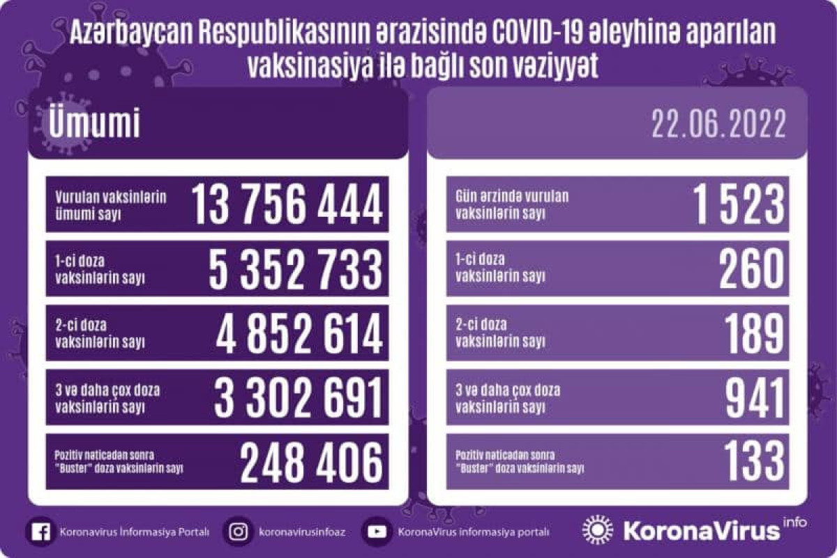 Azərbaycanda son sutkada koronavirus (COVID-19) əleyhinə 1 523 vaksin vurulub. Bir gündə birinci mərhələ üzrə vaksinasiya olunanların sayı 260, ikinci mərhələ üzrə vaksinasiya olunanların sayı 189, üç və daha çox doza üzrə vaksinasiya olunanların sayı 941, pozitiv nəticədən sonra buster doza üzrə vaksinasiya olunanların sayı 133 nəfərdir.