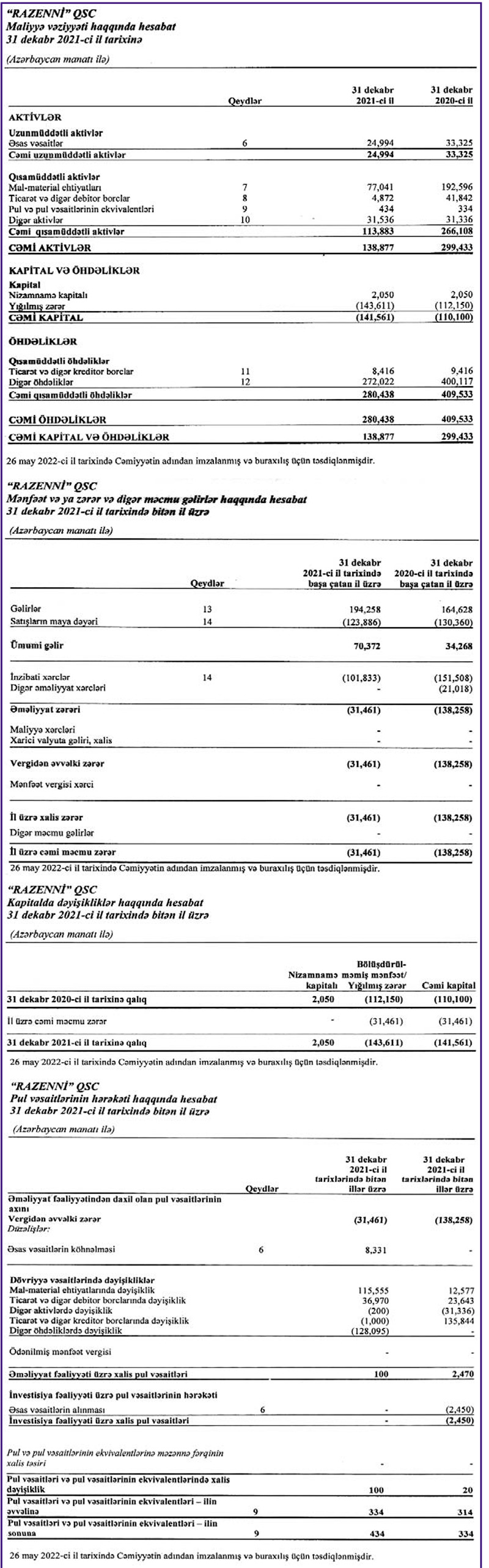 "Razenni" QSC, "Tikinti-Təmir-Təchizat-Bərpa" QSC və "El-Oba" QSC 2021-ci il üzrə maliyyə göstəricilərini açıqlayıblar.