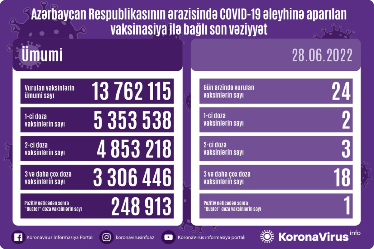 Azərbaycanda son sutkada koronavirus (COVID-19) əleyhinə 24 vaksin vurulub. Bir gündə birinci mərhələ üzrə vaksinasiya olunanların sayı 2, ikinci mərhələ üzrə vaksinasiya olunanların sayı 3, üç və daha çox doza üzrə vaksinasiya olunanların sayı 18, pozitiv nəticədən sonra buster doza üzrə vaksinasiya olunanların sayı 1 nəfərdir.