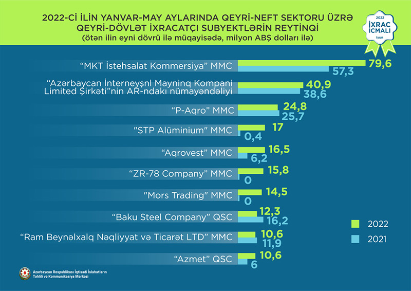 2022-ci ilin yanvar-may ayları üzrə hazırlanan qeyri-dövlət ixracatçı subyektlərin reytinqində ilk onluqda aşağıdakı şirkətlər təmsil olunurlar: “MKT İstehsalat Kommersiya” MMC, “Azərbaycan İnterneyşnl Mayninq Kompani Limited Şirkəti”nin Azərbaycan Respublikasındakı Nümayəndəliyi, “P-Aqro” MMC, “STP Alüminium” MMC, “Aqrovest” MMC, “ZR-78 Company” MMC, “Mors Trading” MMC, “Baku Steel Company” QSC, “Ram Beynəlxalq Nəqliyyat və Ticarət LTD” MMC, “AzMet” QSC.