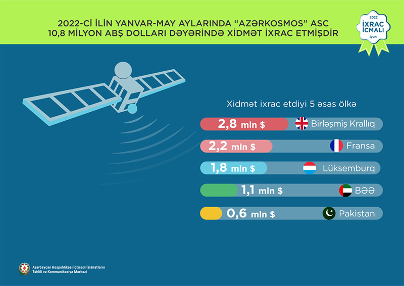 2022-ci ilin yanvar-may ayları ərzində peyk telekommunikasiya və optik peyk xidmətlərinin ixracının ilk beşliyində isə 2,8 milyon ABŞ dolları ilə Birləşmiş Krallıq, 2,2 milyon ABŞ dolları ilə Fransa, 1,8 milyon ABŞ dolları ilə Lüksemburq, 1,1 milyon ABŞ dolları ilə BƏƏ və 0,6 milyon ABŞ dolları ilə Pakistan qərarlaşıb.