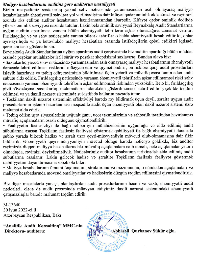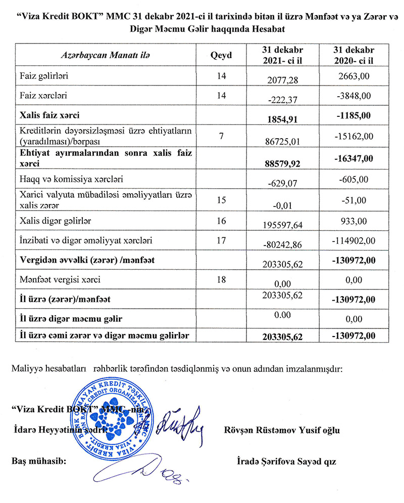 "Viza Kredit Bank Olmayan Kredit Təşkilatı" 2021-ci ili 203 min 305 manat xalis mənfəət ilə başa vurub.