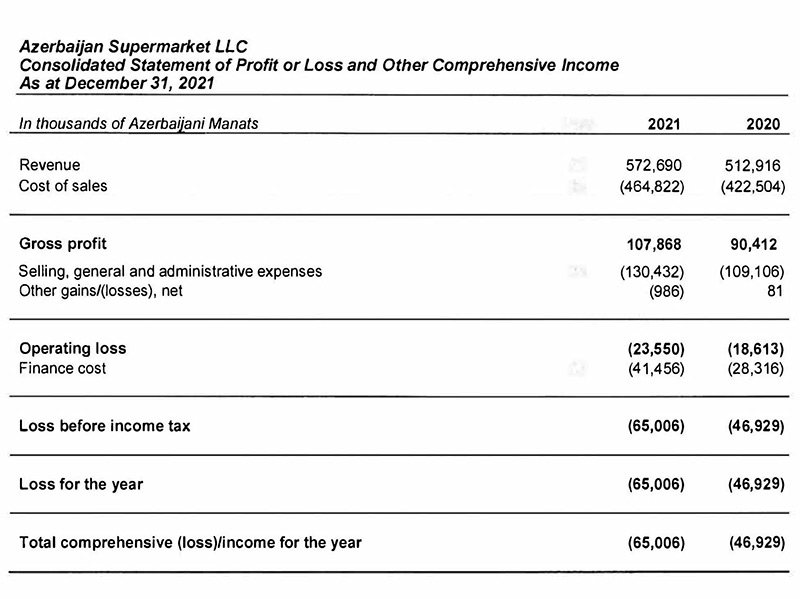 Ötən il “Azərbaycan Supermarket”in 572 milyon 690 min manat cəmi gəlirlərə qarşı cəmi xərcləri 637 milyon 696 min manat təşkil etdiyindən, MMC ili 65 milyon 6 min manat xalis zərər ilə bağlayıb. Şirkət 2020-ci ili 46 milyon 929 min manat xalis zərər ilə bağlamışdı. Qeyd edək ki, “Azərbaycan Supermarket” “Bravo” şəbəkəsinin genişləndirilməsi və inkişaf etdirilməsi çərçivəsində böyük investisiyaları ilə əlaqədar olaraq xərcləri gəlirlərini üstələyir.