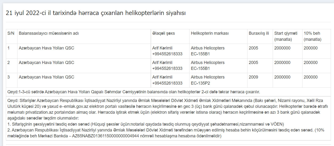 İyulun 21-də təkrar keçiriləcək hərraca çıxarılan hər 3 helikopterin ilkin start qiyməti 2 milyon manatdır. Bunlardan 1-i buraxılış ili 2009-cu il olan “Airbus EC-135P2”, digərləri isə istehsal tarixi 2005-ci il olan “Airbus EC-155B1” markalı helikopterlərdir.