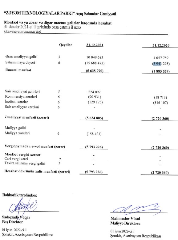 "Azmade Group" şirkətinə daxil olan, metaldan tikinti konstruksiyalarının istehsalı ilə məşğul olan "Zəyəm Texnologiyalar Parkı" ASC 2021-ci il üzrə maliyyə göstəricilərini açıqlayıb.