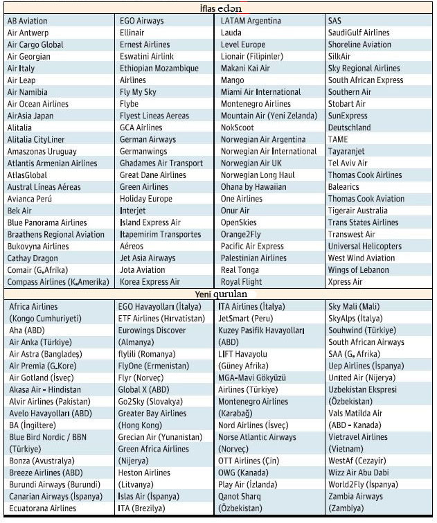 2020-2022-ci il iyun ayının sonunadən olan dövrdə dünya üzrə 89 aviaşirkət müflis olub və ya fəaliyyətini dayandırıb.