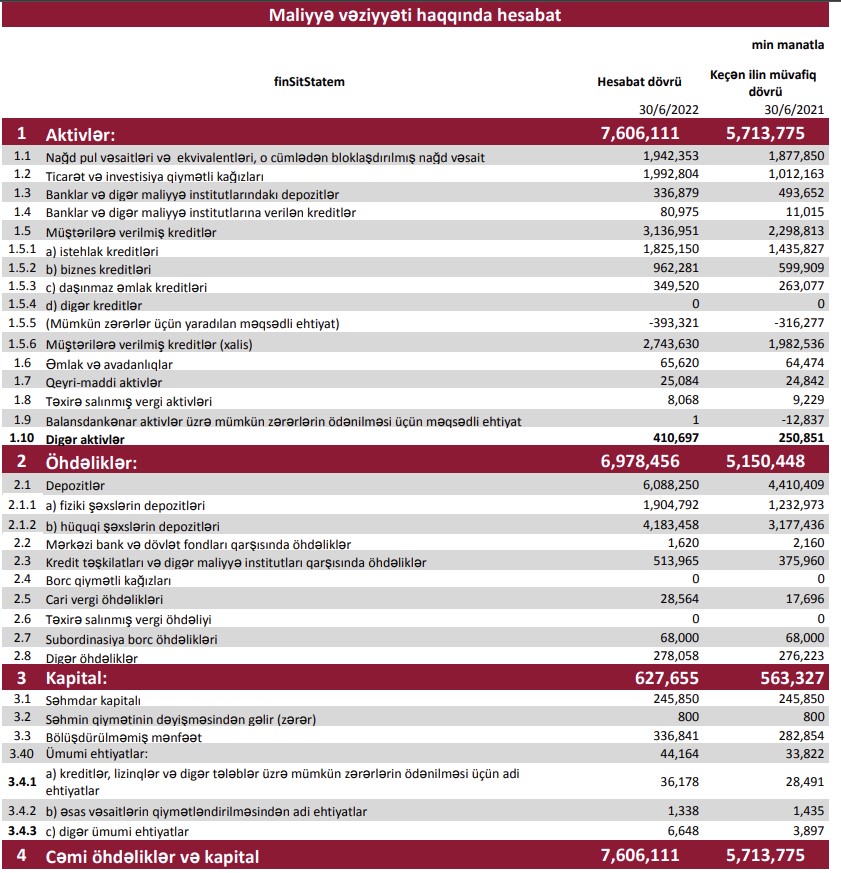 30 İyun 2022-ci il tarixində "Kapital Bank" ASC 628 milyon 181 min manat məcmu kapitala malik olub.
