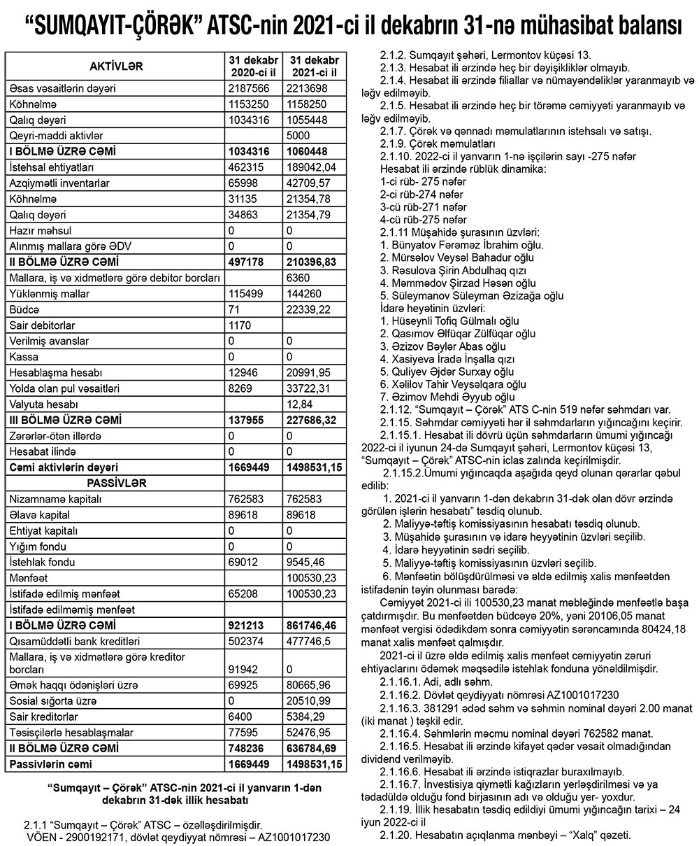 Çörək və qənnadı məmulatlarının istehsalı və satışı fəaliyyətilə məşğul olan "Sumqayıt-Çörək" ATSC 2021-ci ili 100 min 530 manat xalis mənfəət ilə başa vurub. Şirkət 2020-ci ili 65 min 208 manat mənfəət, 52 min 166 manat xalis mənfəət ilə bağlamışdı.