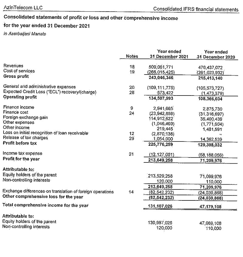 Marja.az şirkətin audit olunmuş maliyyə hesabatlarına xəbər verir ki, 2020-ci ildə "AzİnTelecom”un satışdan gəlirləri 476 milyon 437 min manat ikən, 2021-ci ildə 509 milyon 62 min manata yüksəlib.