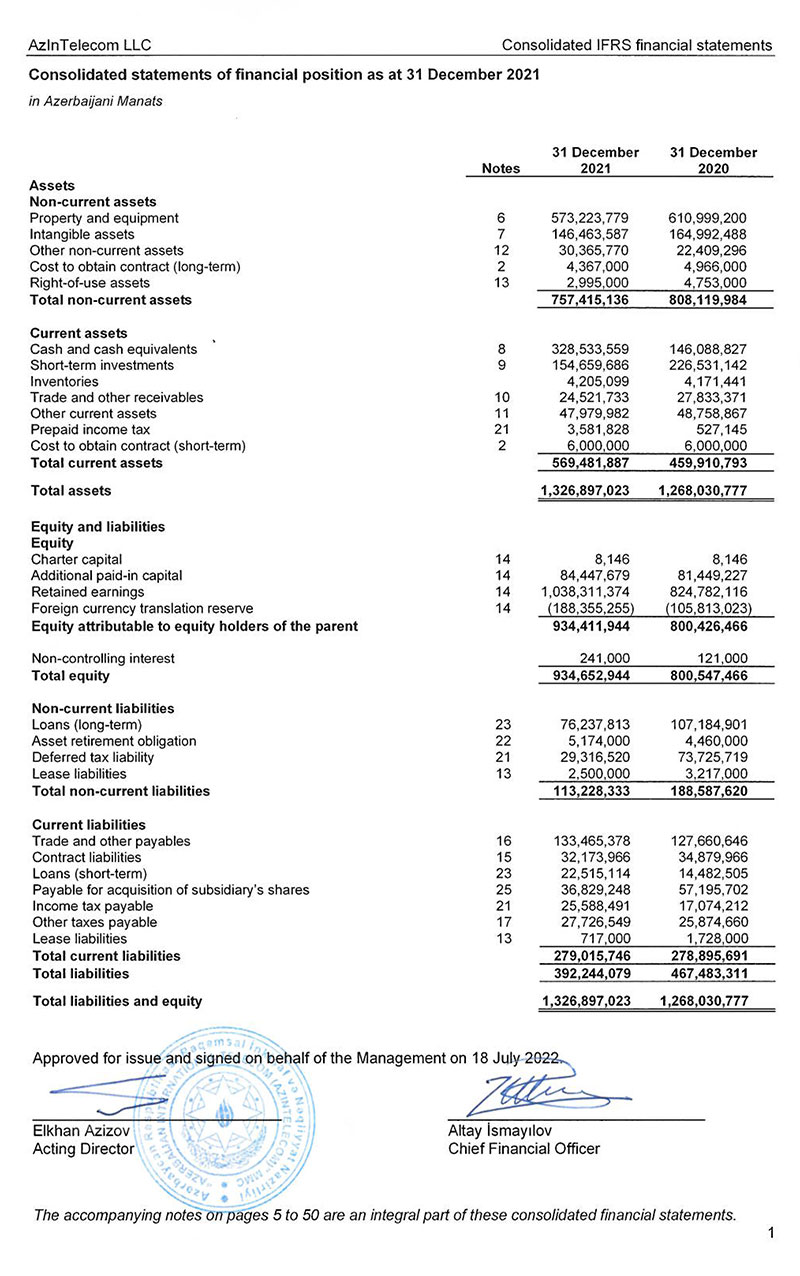 31 Dekabr 2021-ci il tarixində "AzİnTelecom” MMC 1 milyard 326 milyon 897 min manat cəmi aktivlərə malik olub. Şirkət 2020-ci ilin sonunda 1 milyard 268 milyon 31 min manat cəmi aktivlərə malik idi.