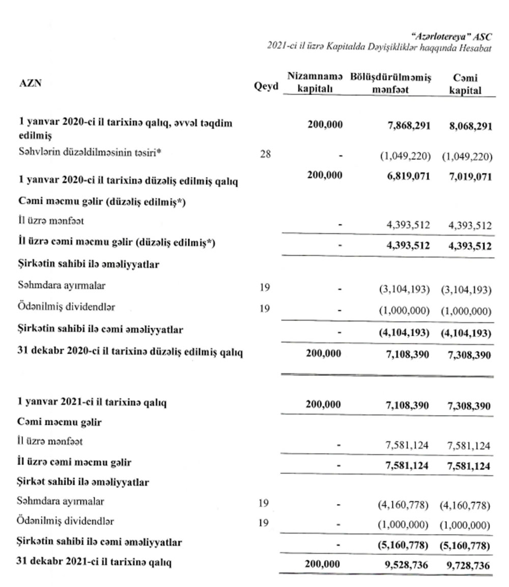 "Azərlotereya" ASC 2020-ci ildə səhmdarına 4 milyon 104 min manat ödəmişdi (səhmdara ayırma olaraq 3 milyon 104 min manat, divident olaraq 1 milyon manat).