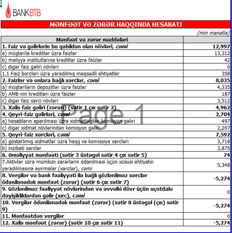 Qeyd edək ki, 2021-ci ilin birinci yarısında Bank BTB-nin cəmi əməliyyat gəlirləri 15 milyon 85 min manat, cəmi əməliyyat xərcləri 14 milyon 977 min manat, əməliyyat mənfəəti 108 min manat təşkil etmişdi. Ehtiyatdan azad olmuş 430 min manat hesabına mənfəət 538 min manata yüksəlmişdi.