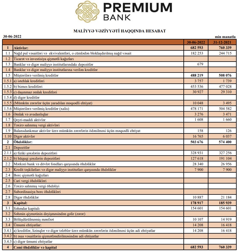 30 İyun 2022-ci il tarixində "Premium Bank" ASC 170 milyon 410 min manat məcmu kapitala malik olub.