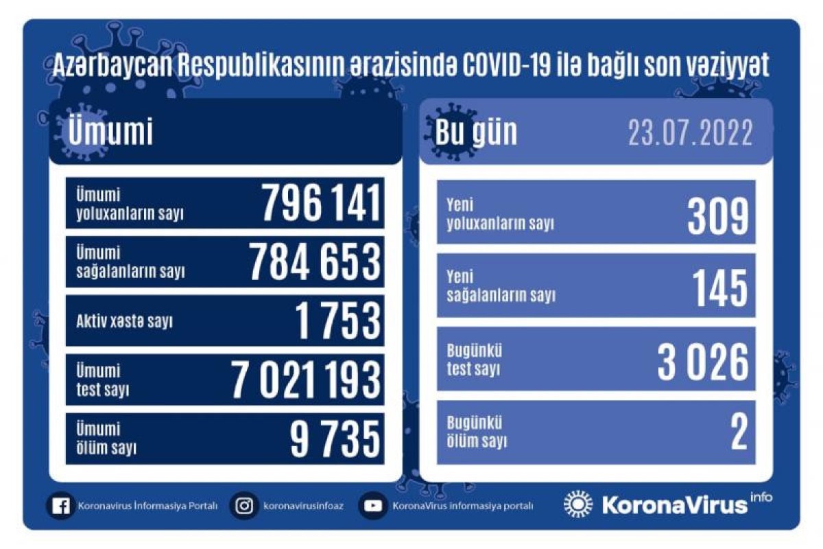 Azərbaycanda koronavirus (COVID-19) infeksiyasına 309 yeni yoluxma faktı qeydə alınıb, 145 nəfər müalicə olunaraq sağalıb.
