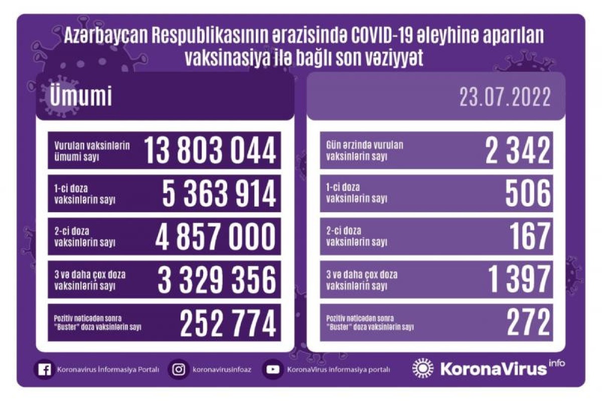 Bir gündə birinci mərhələ üzrə vaksinasiya olunanların sayı 506, ikinci mərhələ üzrə vaksinasiya olunanların sayı 167, üç və daha çox doza vaksin vurduranların sayı 1 397, pozitiv nəticədən sonra buster doza üzrə vaksinasiya olunanların sayı isə 272 nəfərdir.