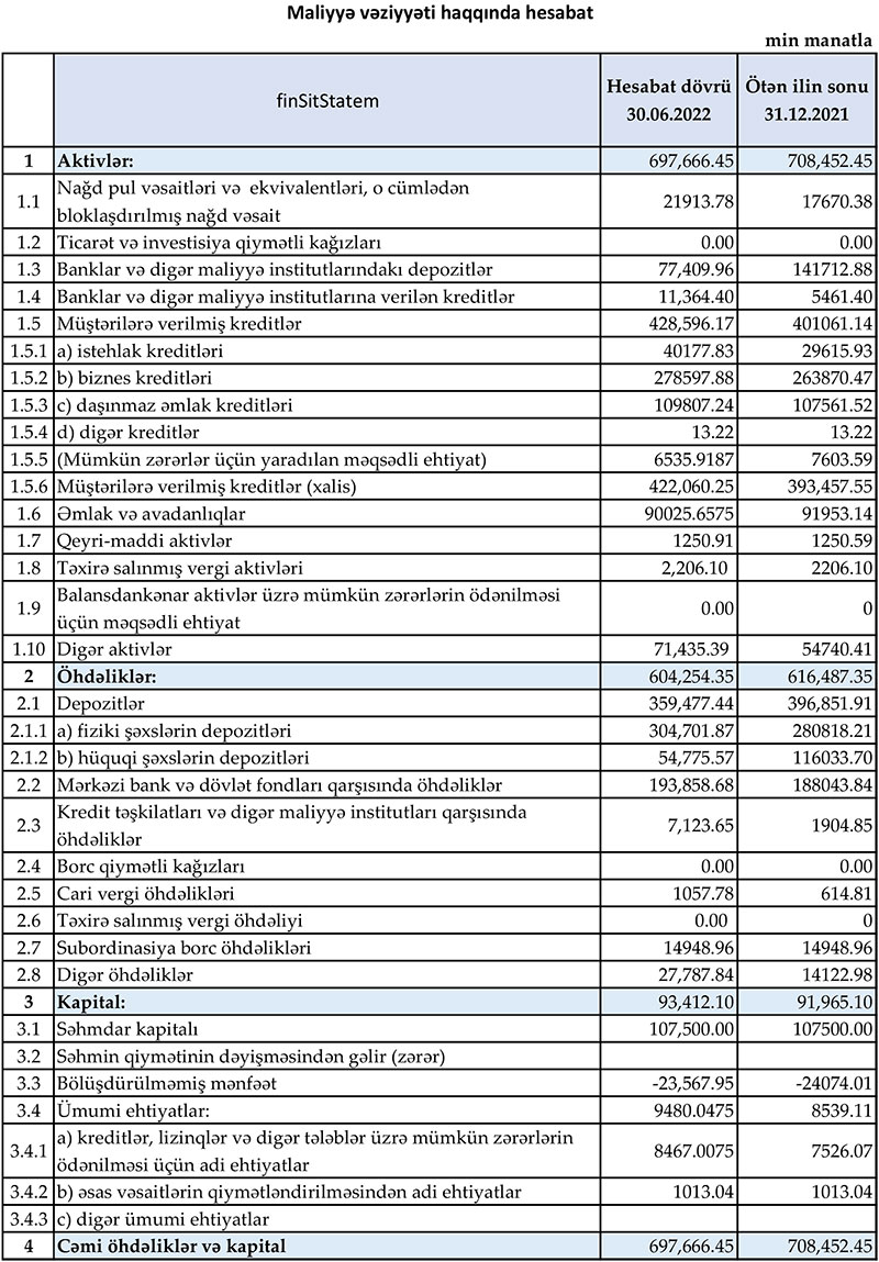 Müqayisə üçün qeyd edək ki, 2021-ci ilin yanvar-iyun dövründə “Muğanbank” ASC-nin cəmi əməliyyat gəlirləri 28 milyon 490 min manat, cəmi əməliyyat xərcləri 27 milyon 722 min manat, əməliyyat mənfəəti 768 min manat, mümkün zərərlər üçün yaradılan ehtiyatlara ayrılan məbləğ 212 min manat, xalis mənfəəti 556 min manat təşkil etmişdi.