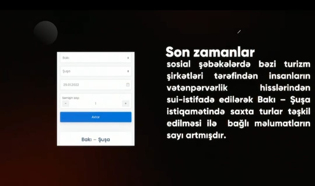 Qurumun Mətbuat Xidmətindən bildirilib ki, son zamanlar sosial şəbəkələrdə bəzi turizim şirkətləri tərəfindən insanların vətənpərvərlik hislərindən sui-istifadə edərək Bakı-Şuşa istiqamətində saxta turlar təşkil edilməsi ilə bağlı məlumatların sayı artıb.