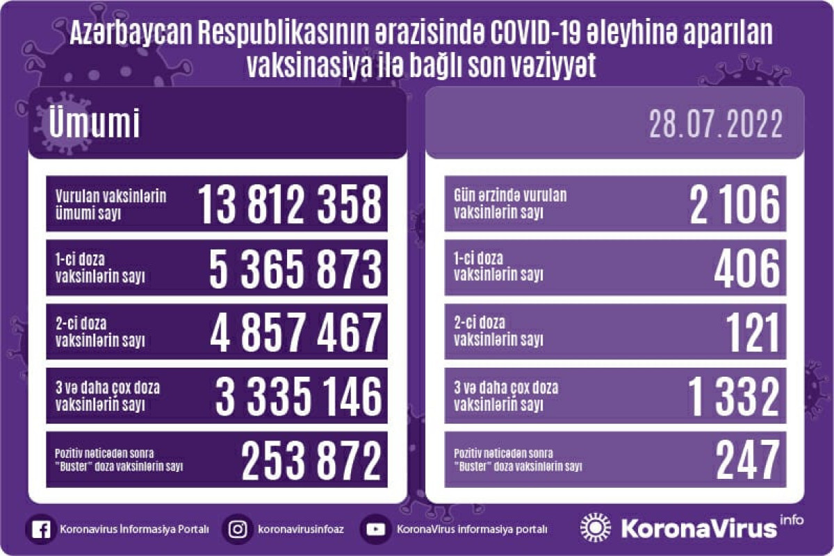 Azərbaycanda son sutkada koronavirus (COVID-19) əleyhinə 2106 vaksin vurulub. Bir gündə birinci mərhələ üzrə vaksinasiya olunanların sayı 406, ikinci mərhələ üzrə vaksinasiya olunanların sayı 121, üç və daha çox doza üzrə vaksinasiya olunanların sayı 1332, pozitiv nəticədən sonra buster doza üzrə vaksinasiya olunanların sayı 247 nəfərdir.