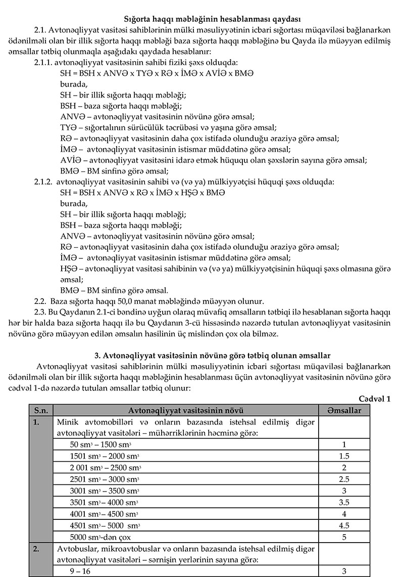 Qeyd edək ki, avtomobil sahibləri üçün illik sığorta haqları 50 - 470 manat civarında olacaqdır. Yaşı və sürücülük təcrübəsi az, avtomobilinin mühərrik həcmi yüksək, Bakı və Sumqayıtda yaşayanlar, avtomobilinin yaşı 20-dən artıq olanlar daha yüksək sığorta haqları ödəyəcəklər.