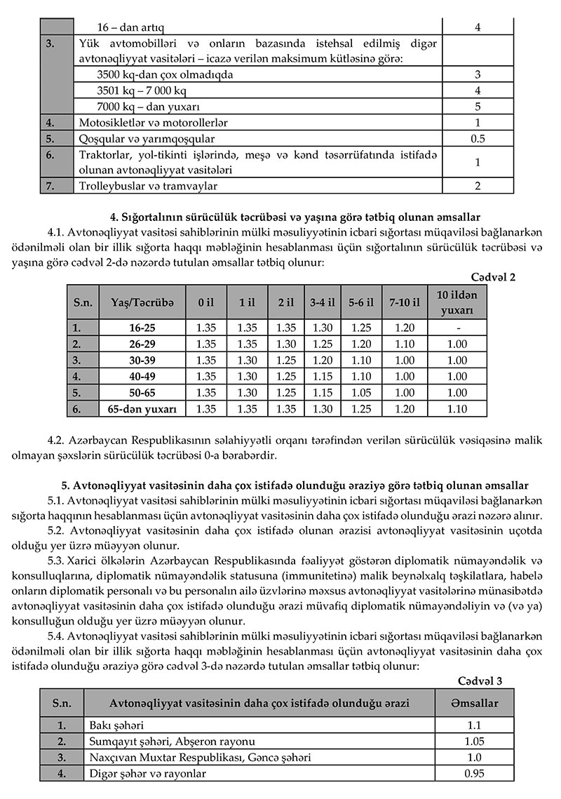 O qeyd edib ki, baza sığorta haqqı, yəni 50 manat dəyişdirilmir və olduğu kimi qalır. Lakin, risk səviyyəsinə görə baza sığorta haqqına yeni əmsallar tətbiq edilir: